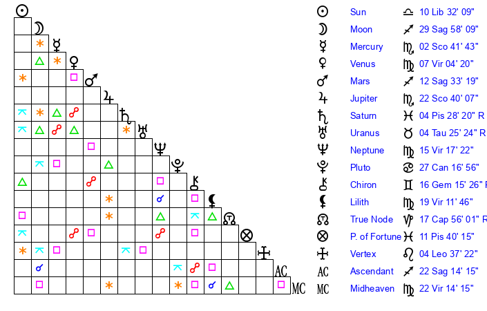 | Moon | 29 Sagittarius 58 | 8 Pisces 37 | 25 Aries 15 |