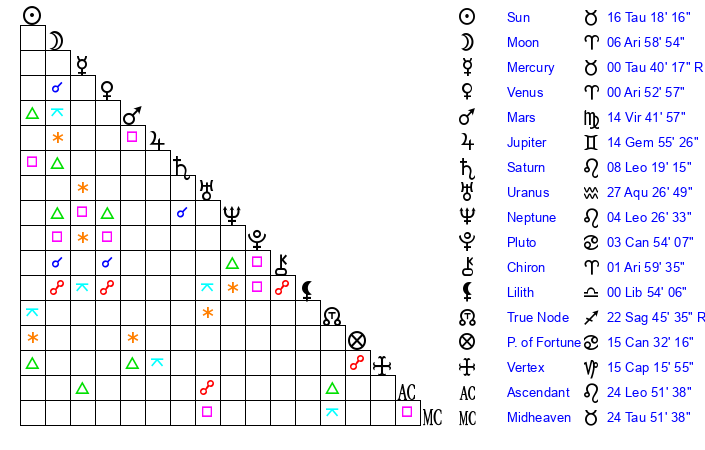 | Sun | 16 Taurus 18 | 17 Taurus 23 | 28 Leo 46 |