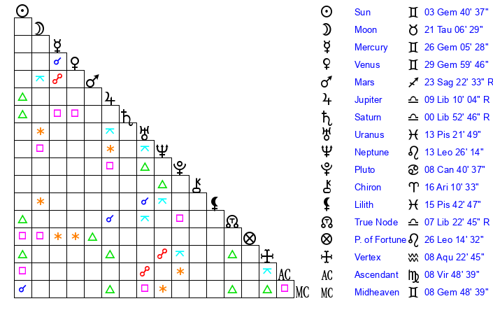 | Sun | 3 Gemini 41 | 4 Gemini 44 | 12 Virgo 20 |