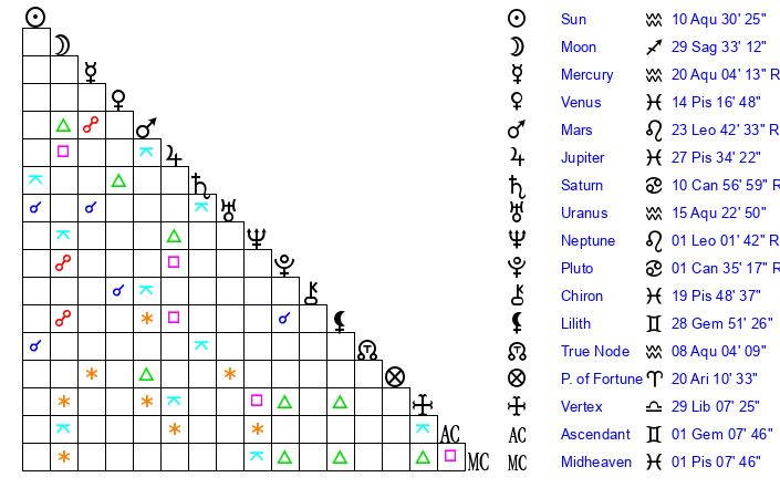 | Moon | 29 Sagittarius 44 | 10 Pisces 40 | 27 Sagittarius 44 |