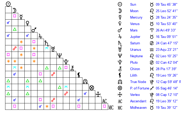 | Moon | 25 Leo 46 | 21 Gemini 21 | 11 Leo 40 |