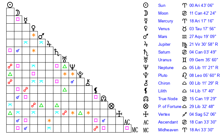 | Neptune | 5 Libra 11 | 29 Pisces 40 | 3 Libra 40 |