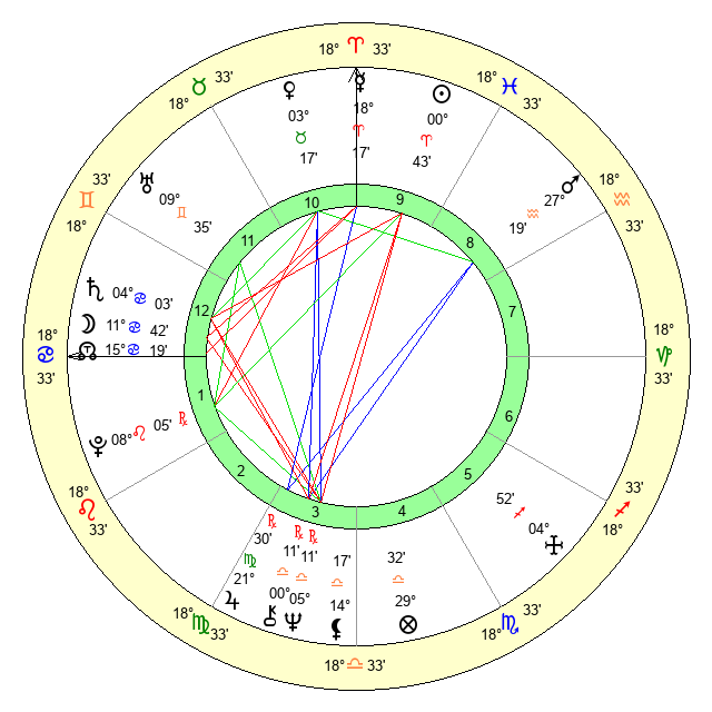 | Saturn | 4 Cancer 26 | 23 Pisces 10 | 11 Cancer 15 |