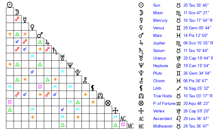 Sun | 20 Taurus 36 | 21 Taurus 58 | 9 Virgo 49 |
