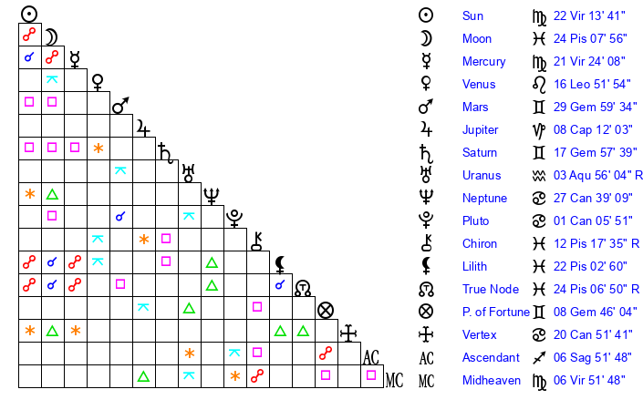 | Mercury | 21 Virgo 24 | 25 Virgo 5 | 2 Capricorn 54 |