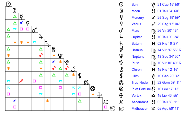 Moon | 1 Taurus 40 | 23 Gemini 27 | 17 Cancer 58 |