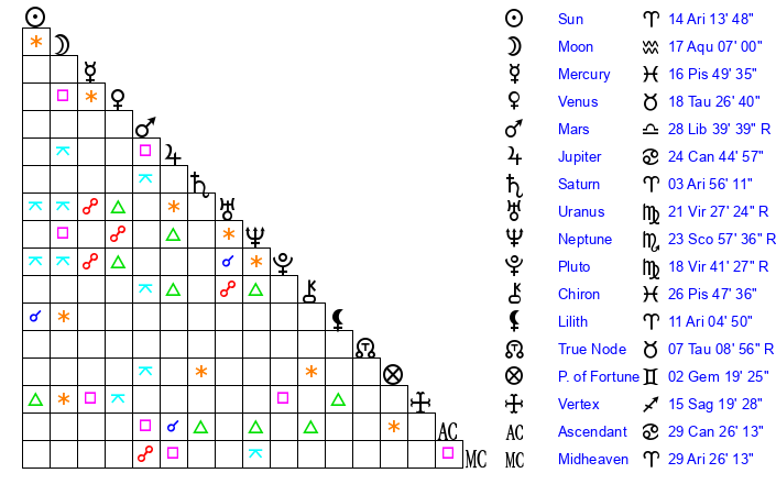 Sun | 14 Aries 14 | 15 Aries 10 | 10 Gemini 31 |