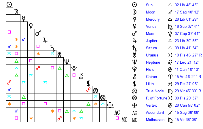 | Moon | 17 Sagittarius 46 | 27 Scorpio 46 | 15 Virgo 44 |