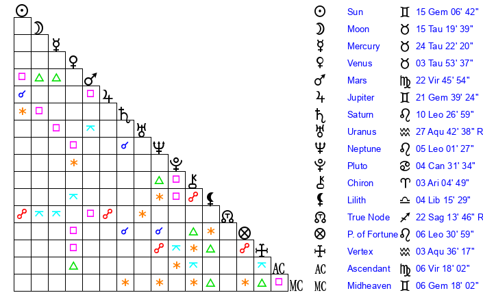 | Sun | 15 Gemini 6 | 16 Gemini 12 | 27 Virgo 50 |