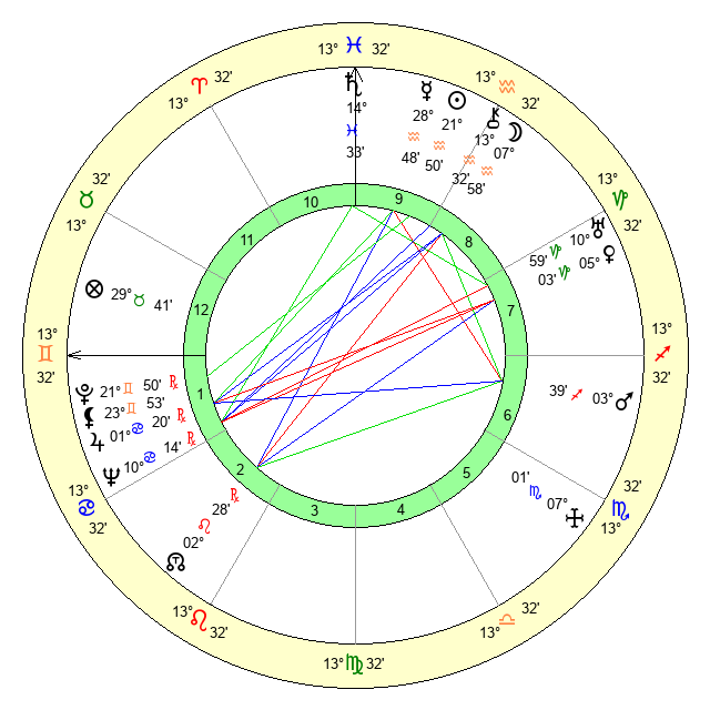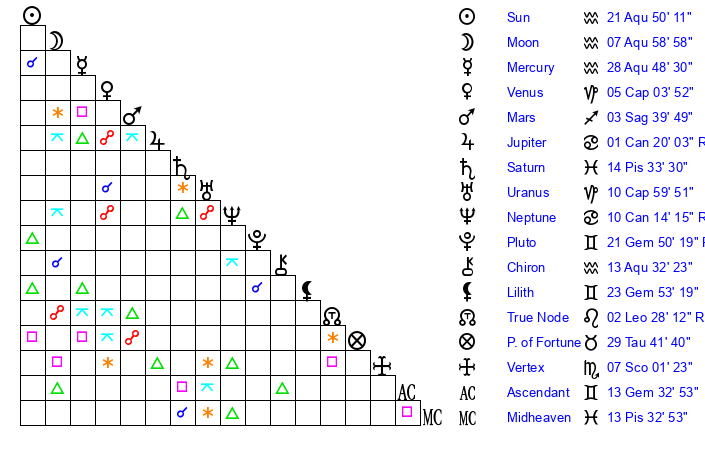 | Sun | 21 Aquarius 50 | 23 Aquarius 13 | 17 Gemini 41 |