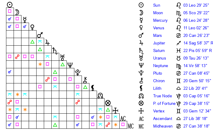 | Moon | 5 Scorpio 32 | 27 Leo 48 | 2 Aquarius 8 |