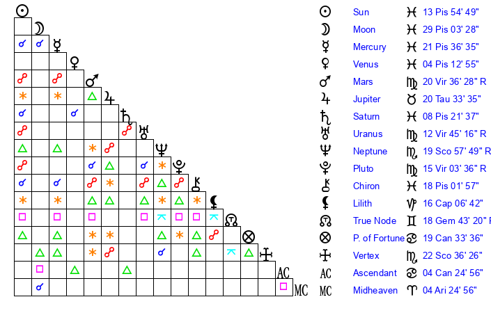 Neptune | 19 Scorpio 57 | 29 Pisces 1 | 18 Scorpio 47 |
