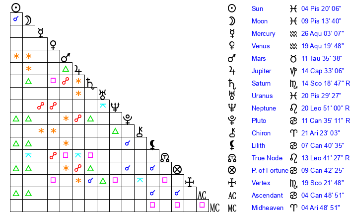 | Sun | 4 Pisces 20 | 5 Pisces 5 | 12 Gemini 20 |