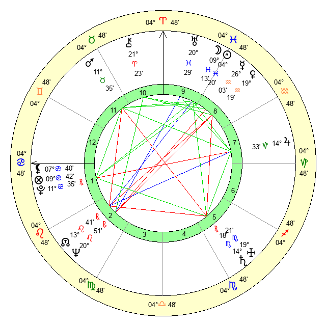 | Mars | 11 Taurus 36 | 17 Cancer 1 | 15 Cancer 32 |
