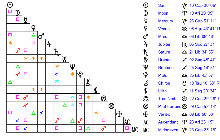 | Sun | 13 Capricorn 0 | 13 Capricorn 19 | 27 Aquarius 42 |