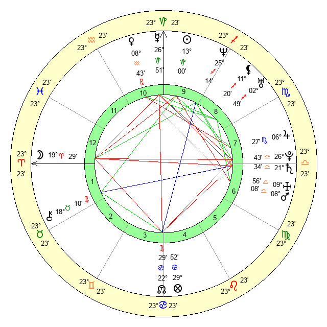| Moon | 19 Aries 34 | 17 Cancer 21 | 6 Sagittarius 59 |