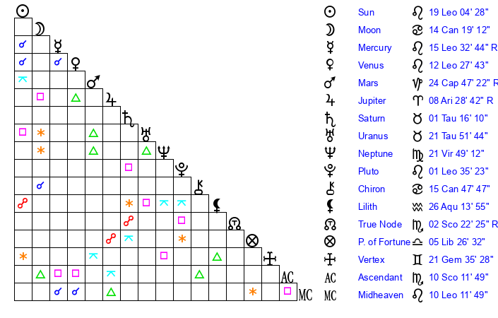 | Mercury | 15 Leo 32 | 4 Leo 21 | 6 Sagittarius 21 |