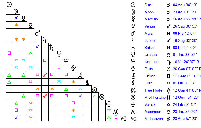 | Sun | 4 Aquarius 33 | 5 Aquarius 59 | 3 Taurus 20 |