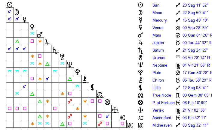 | Sun | 20 Sagittarius 12 | 20 Sagittarius 55 | 27 Pisces 22 |
