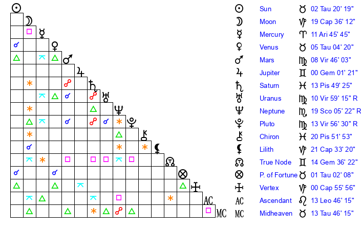 Pluto | 13 Virgo 56 | 3 Aquarius 46 | 13 Virgo 53 |