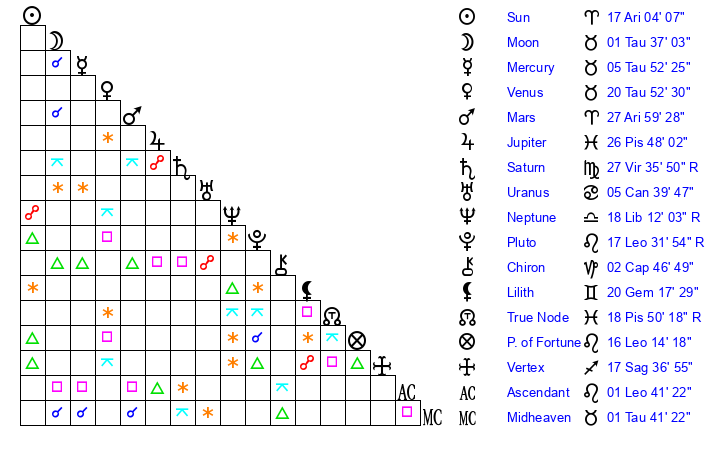 | Venus | 20 Taurus 52 | 25 Pisces 13 | 13 Leo 51 |