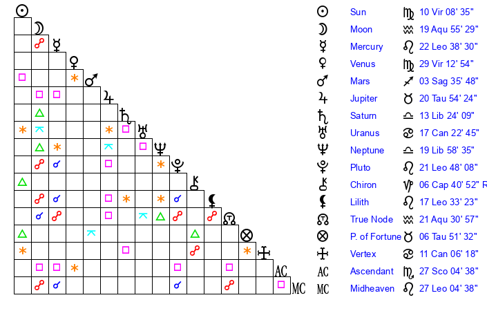 | Mercury | 22 Leo 38 | 0 Virgo 17 | 14 Sagittarius 26 |