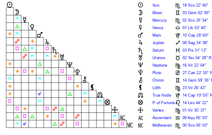 | Sun | 18 Scorpio 22 | 19 Scorpio 33 | 19 Aquarius 47 |