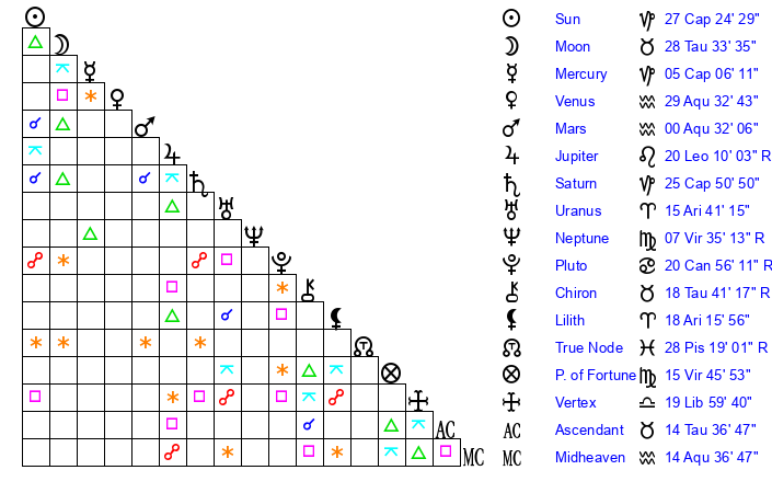 | Sun | 27 Capricorn 24 | 28 Capricorn 51 | 0 Taurus 23 |