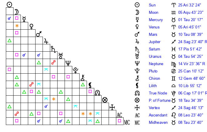| Venus | 5 Aries 45 | 24 Pisces 47 | 25 Cancer 2 |