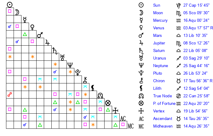 | Neptune | 25 Sagittarius 45 | 27 Pisces 36 | 26 Sagittarius 50 |