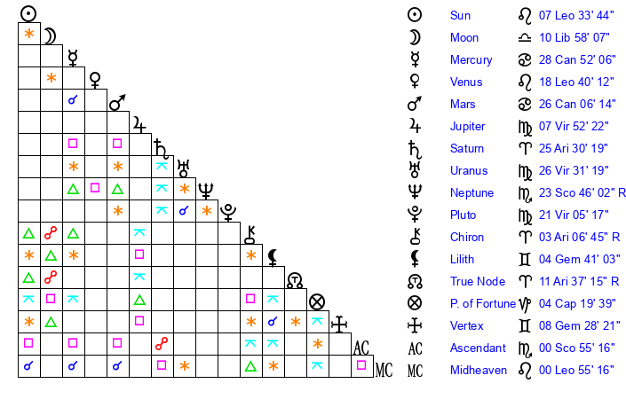Moon | 10 Libra 59 | 17 Libra 55 | 15 Scorpio 43 |