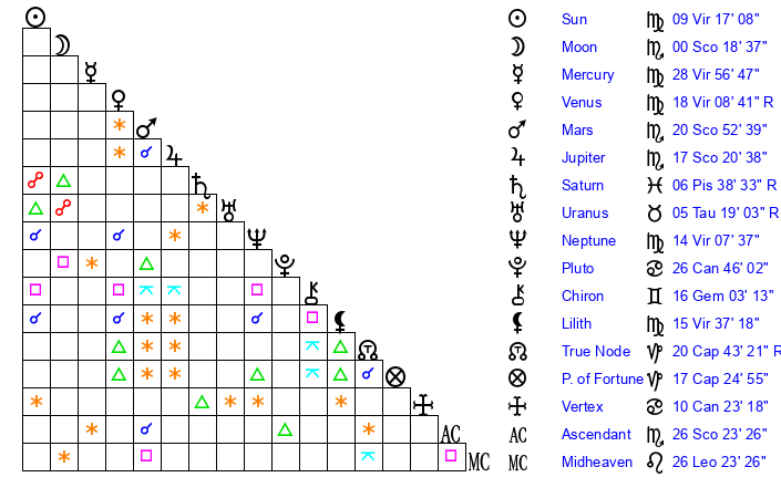| Sun | 9 Virgo 17 | 10 Virgo 28 | 8 Sagittarius 34 |