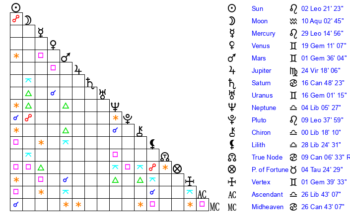 | Moon | 10 Aquarius 7 | 14 Leo 26 | 11 Capricorn 59 |