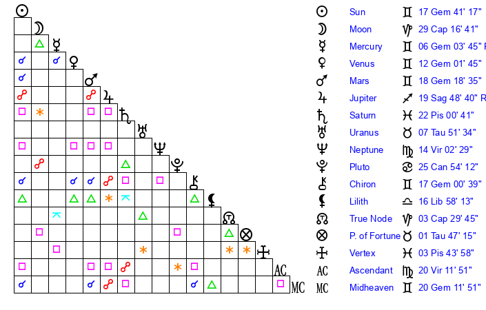 | Sun | 17 Gemini 41 | 18 Gemini 9 | 12 Virgo 55 |