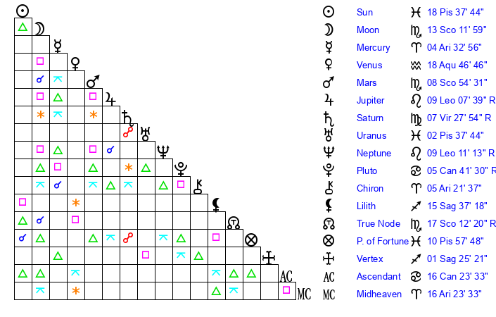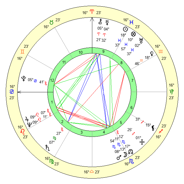 | Moon | 13 Scorpio 7 | 24 Cancer 5 | 21 Virgo 21 |