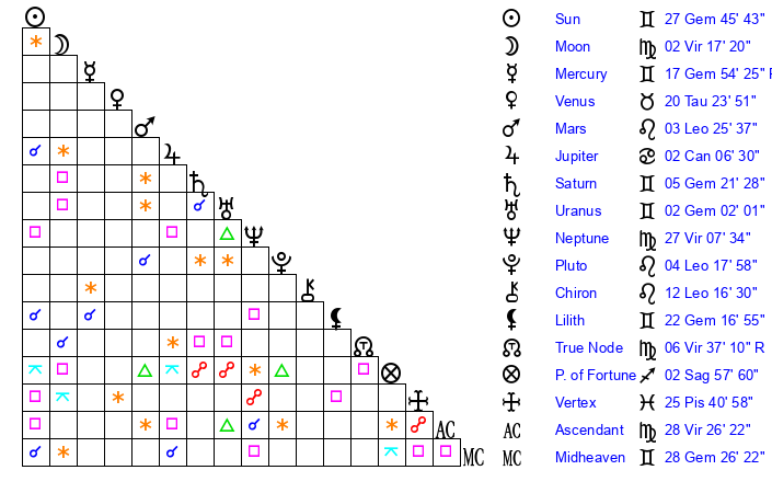 | Sun | 27 Gemini 46 | 28 Gemini 40 | 17 Virgo 20 |