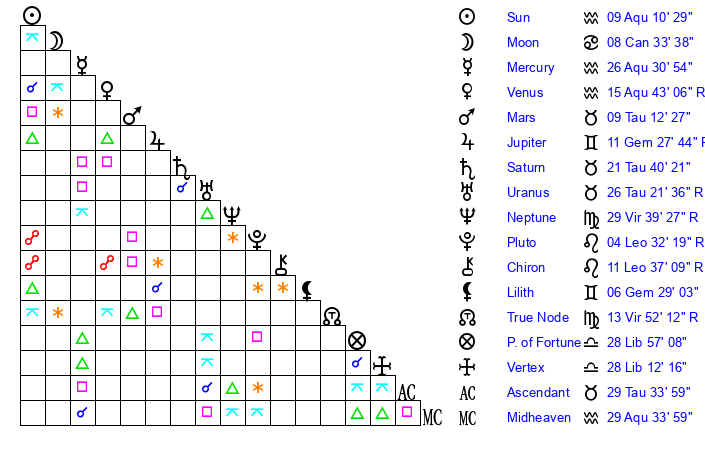 | Sun | 9 Aquarius 10 | 10 Aquarius 2 | 1 Taurus 56 |