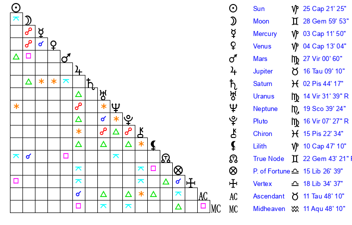 Pluto | 16 Virgo 8 | 1 Aquarius 31 | 14 Virgo 45 |