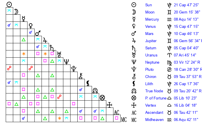 | Venus | 15 Capricorn 48 | 9 Pisces 53 | 14 Taurus 17 |