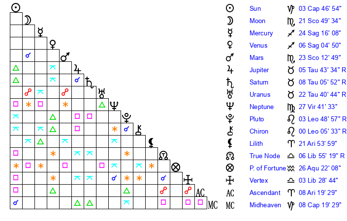 | Saturn | 8 Taurus 17 | 25 Pisces 44 | 12 Taurus 13 |