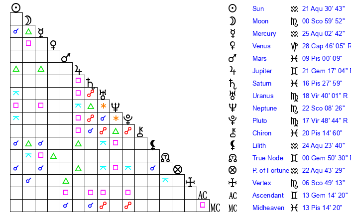Pluto | 17 Virgo 49 | 2 Aquarius 21 | 16 Virgo 20 |