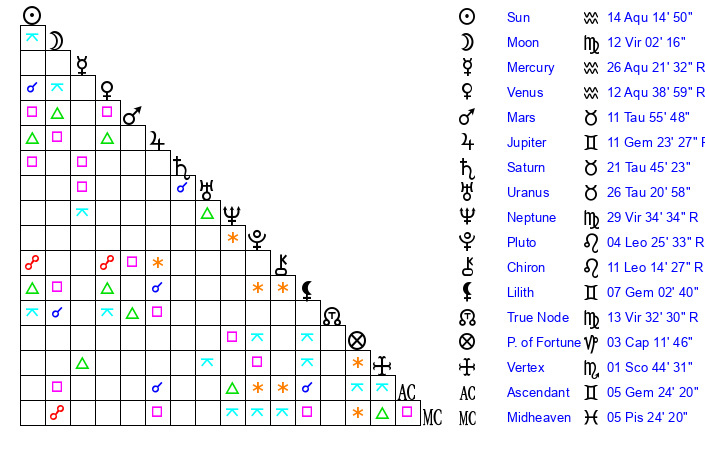 | Sun | 14 Aquarius 15 | 15 Aquarius 7 | 6 Taurus 48 |