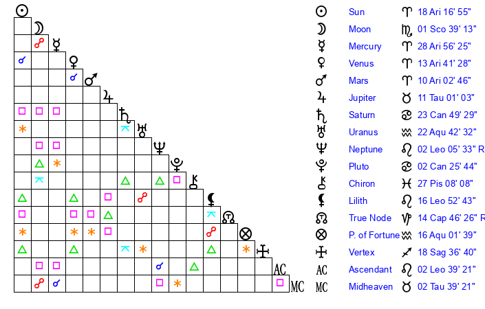| Sun | 18 Aries 17 | 19 Aries 6 | 2 Leo 8 |