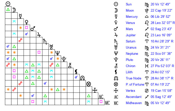 Pluto | 20 Virgo 27 | 1 Aquarius 34 | 22 Virgo 18 |