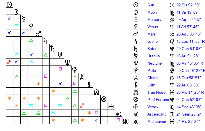 | Sun | 2 Pisces 52 | 4 Pisces 19 | 4 Gemini 14 |