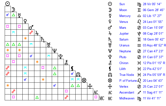 | Moon | 6 Gemini 23 | 27 Virgo 27 | 14 Cancer 4 |