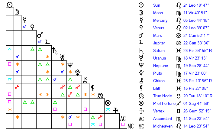 Moon | 11 Virgo 34 | 14 Gemini 37 | 13 Scorpio 12 |