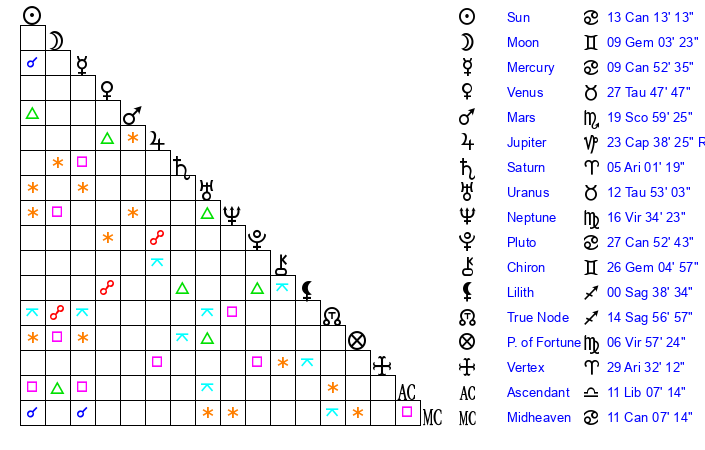 | Sun | 13 Cancer 13 | 13 Cancer 55 | 8 Libra 5 |