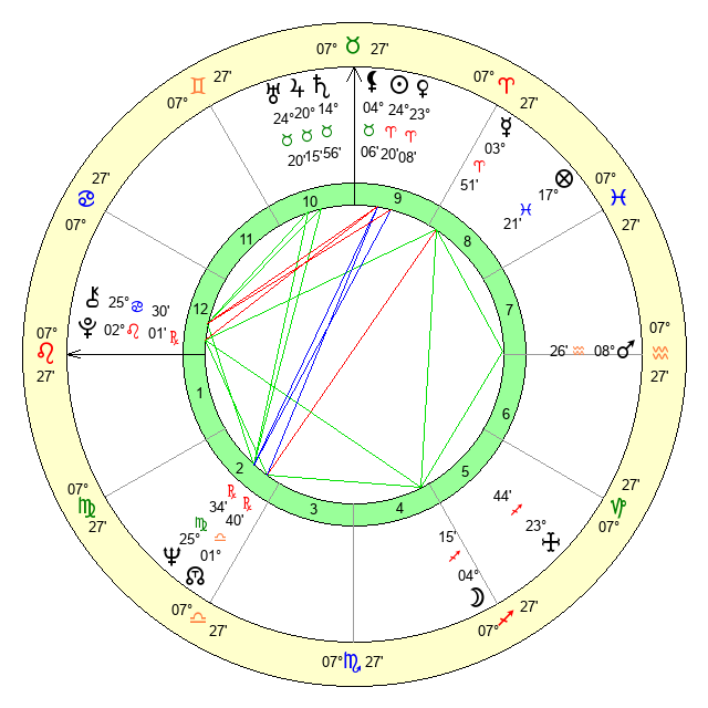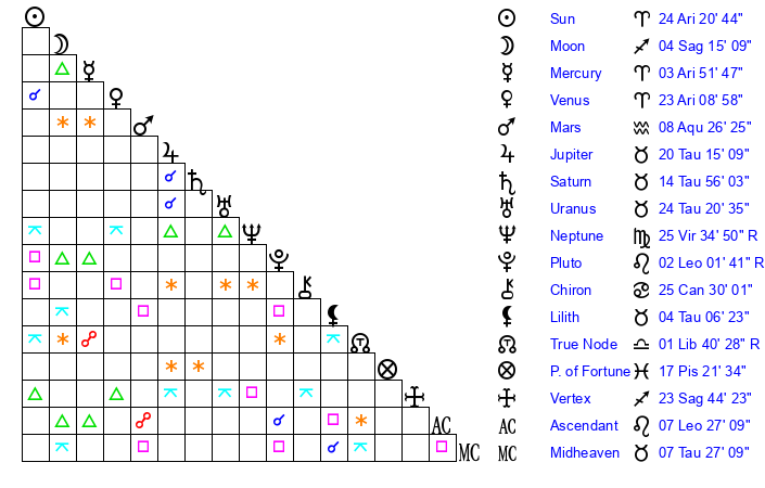 | Venus | 23 Aries 9 | 24 Pisces 42 | 6 Leo 20 |