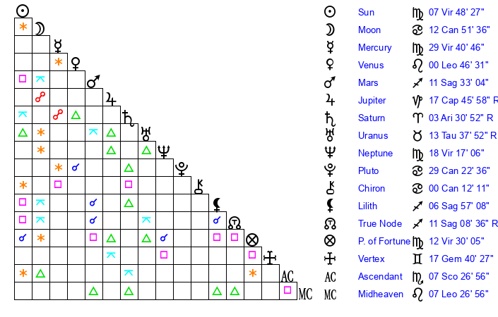 Mercury | 29 Virgo 40 | 26 Leo 25 | 20 Sagittarius 55 |